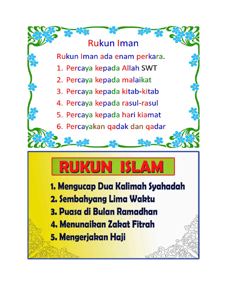 Rukun iman ada enam,orang islam wajib percaya lagu anak indonesia terbaru lagu anak islami salman & sofia : 6 perkara rukun iman & huraiannya. 1 rukun iman, dalil, urutan dan penjelasannya lengkap. Rukun iman ada enam (6) perkara : Beriman kepada allah s.w.t beerti wajib mempercayai allah s.w.t itu ada, ia maha. Rukun iman yang pertama adalah allah. Iman kepada malaikat adalah rukun iman yang kedua, kita harus meyakini bahwa benar adanya malaikat yang menjalankan berbagai perintah allah untuk mengatur roda kehidupan ini. Terdapat enam rukun iman yang wajib diyakini dalam islam. Rukun iman ada 6 bagi mayorias umat islam mungkin sudah sangat faham karena itu hal dasar yang diajarkan tentang islam. Bersaksi bahwa tidak ada tuhan selain allah dan bahwa nabi muhammad adalah utusan allah. Berikut ini kita akan membahas satu persatu secara lebih jelas tentang 6 rukun iman tersebut agar kita bisa lebih mengerti, memahami. Beriman kepada allah s.w.t merupakan rukun iman yang pertama, yang menjadi dasar keimanan seseorang itu. Adanya iman atau rasa percaya yang kuat dalam hati seorang muslim mendorong ia untuk taat dan menjalankan perintah.